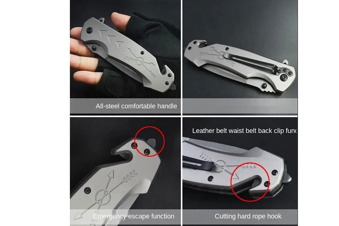 Knife is Two-Handed Knife, open manually, need two hands to open, not spring assisted opening knife. When you place an order, please pay attention to this. Description: Full length: 23cm (9 inch) Blade length: 9.7cm (3.8inch) Handle length: 13.2cm (5.2inch) Blade width: 3.8cm (1.5inch)(the widest point) Blade thickness: 3.3mm (1.3inch) Blade material: 7cr17mov Hardness: 56HRC Handle: steel handle Surface: all titanium Weight: 335g (0.74lb)(with package) Package: with nylon sheath, black box.